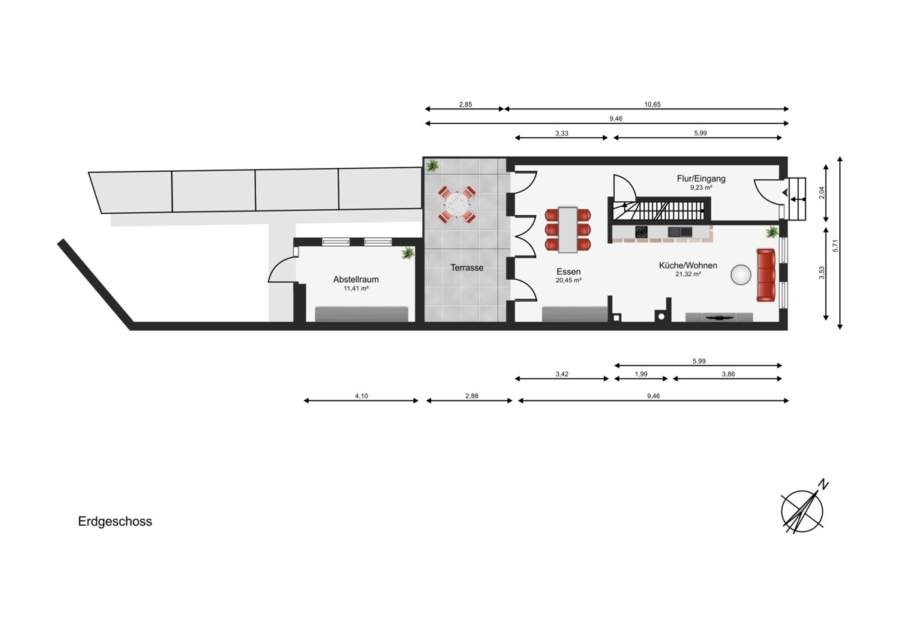Abgerundet wird das Angebot durch eine Nord-Terrasse und ein kompaktes, ca. 158 m² großes Grundstück mit überschaubarem Pflegeaufwand, welches auch über einen rückwärtigen Zugang verfügt.