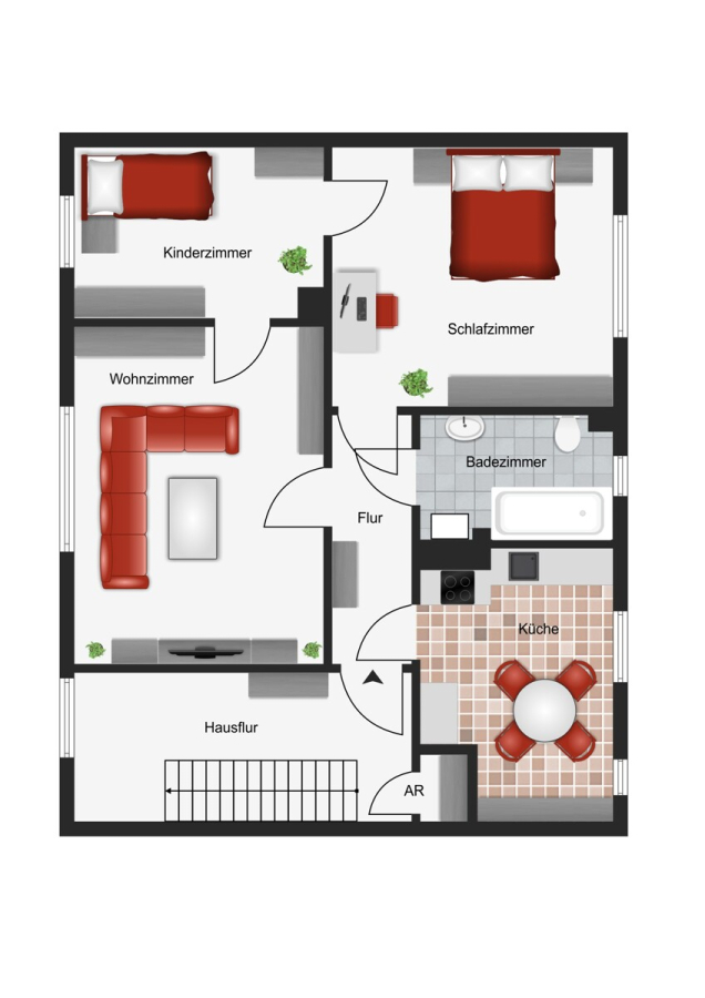 Auf das Beifügen von Fotos der vermieteten Wohnung im Erdgeschoss haben wir verzichtet, um die Privatsphäre des Mieters zu schützen.
